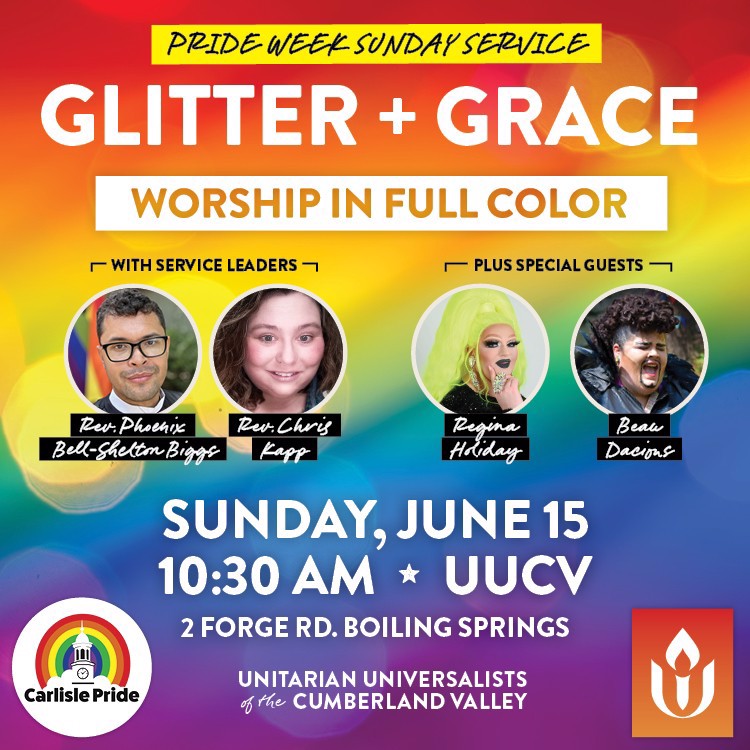 June 15 - "Glitter and Grace: Worship in Full Color" On their first Sunday at UUCV, Rev. Phoenix Bell-Shelton Biggs invites us into a celebration of sacred authenticity. Drawing from world religions, queer wisdom, and Unitarian Universalist values, this homily proclaims that drag is not just performance—it’s revelation. Come be reminded that you are fearfully, wonderfully, and fabulously made. Rev. Phoenix Bell-Shelton Biggs preaches with LGBTQ Congregants as worship associates.